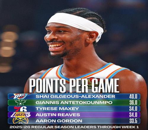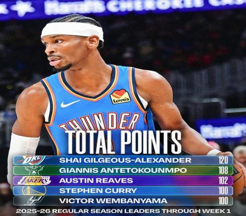 NBA首周球员数据:亚历山大得分王,字母哥篮板王&文班盖帽王