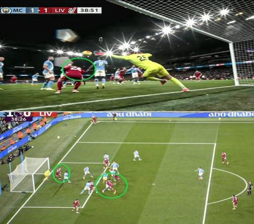 上半场伤停补时阶段,尼科-冈萨雷斯远射,皮球击中范戴克折射入网,曼城半场2球领先。