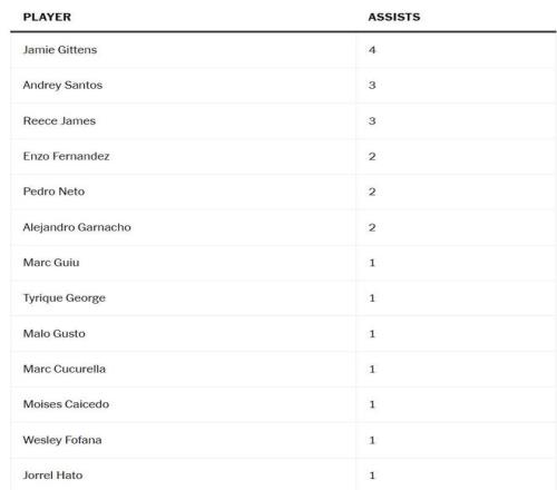 帕尔默的创造力也是难以替代的,虽然助攻并不是衡量这方面能力的唯一指标,但仍然值得注意,在这同样的13场比赛中,有13名不同的球员至少贡献了一次助攻。