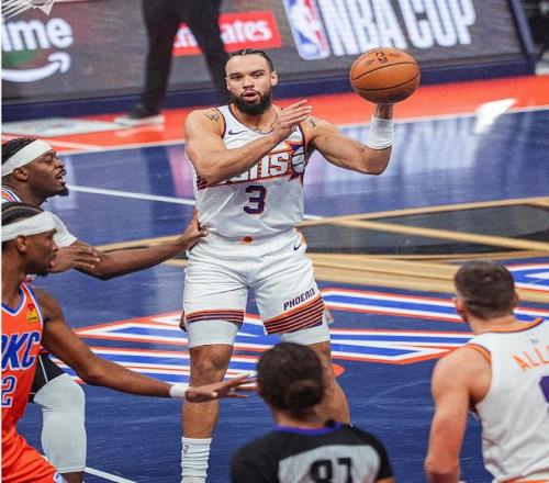 西部NBA杯1/4决赛首场比赛正式开打,太阳队这边布克、杰伦格林两大核心依旧无法出战,狄龙、奥尼尔、威廉姆斯、吉莱斯皮、阿伦先发,雷霆这边哈滕、乔不打多特、杰伦·威廉姆斯、霍姆格伦、华莱士、亚历山大先发迎战!赛前ESPN给出雷霆胜率达到了88.9%说明这场对决普遍认为太阳机会渺茫,现阶段雷霆正处于23胜1负开局的良好状态,15连胜风头无两,场均得分123.0分(联盟第2),场均失分106.9分(联盟第1),攻防效率全部都在联盟前列是一支史诗级强队,此役卡鲁索、多特两大顶级3D复出,亚历山大休战一场后也重新回到场上,从阵容结构来看就足以证明雷霆对于本场比赛的重视程度。太阳这边目前总战绩14胜10负排名西部第7,过去5场输掉了其中的3场,平心而论太阳能打出如此战绩已经超过了许多球迷预期!
