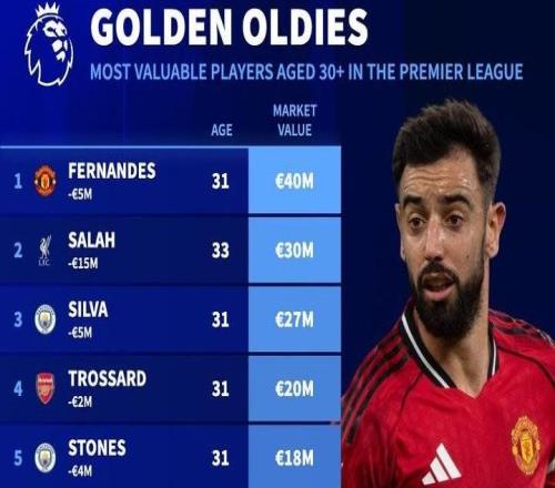 德转列英超30+岁球员身价榜:B费4000万欧居首,萨拉赫第二 -